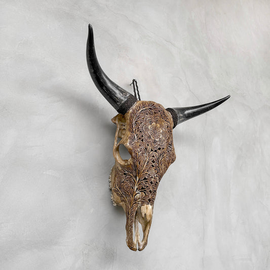 Feuille de Feu | Crâne de Vache Sculpté à la Main